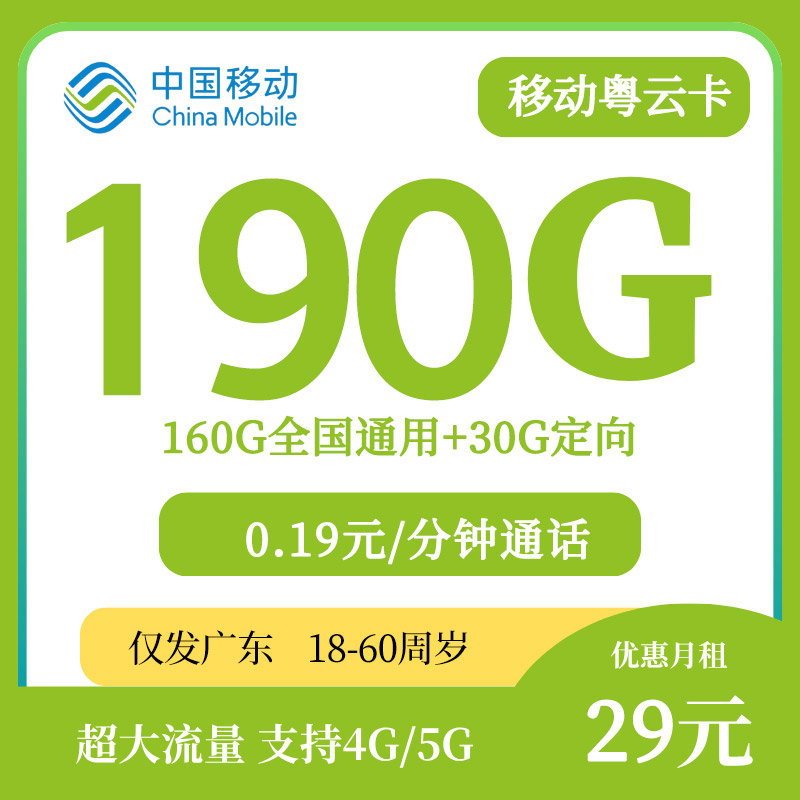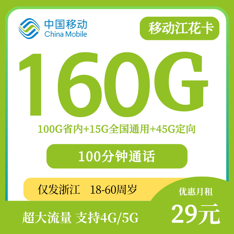 【浙江专属】移动江花卡29元160G流量+100分钟