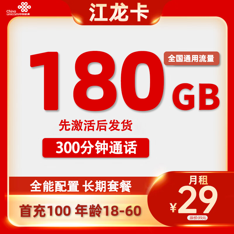 【发全国】联通江龙卡 29元180G+300分钟通话