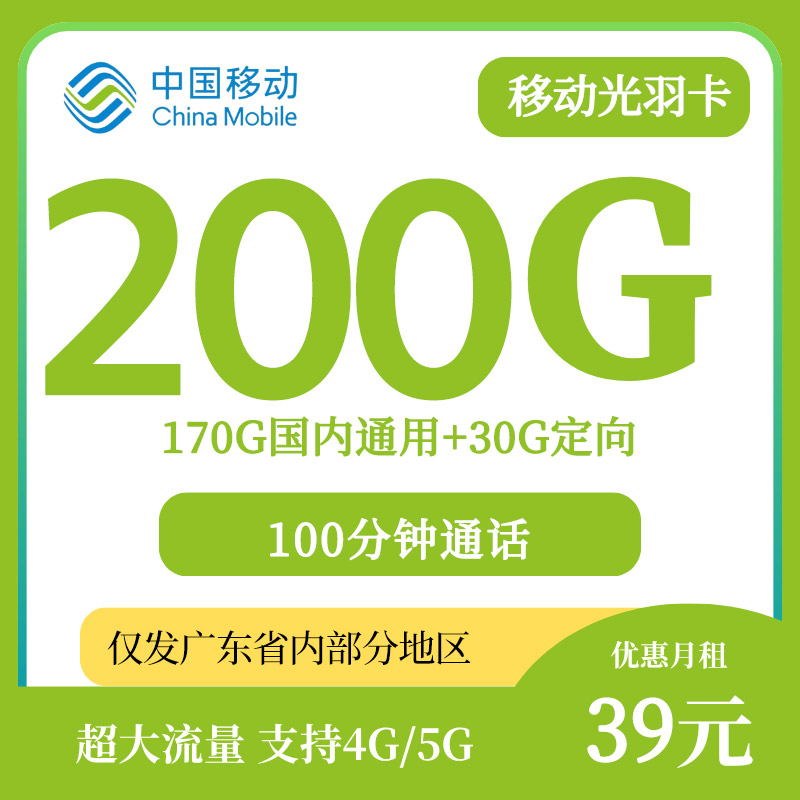 【广州、深圳、佛山专属】移动光羽卡39元200G通用流量+100分钟通话