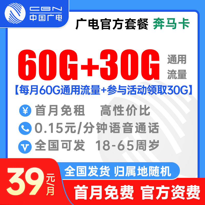 【全国发货】广电奔马卡39元60G全国通用流量+参与活动领取30G