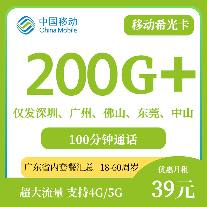 【广东专属】移动希光卡39元200G通用流量+100分钟通话