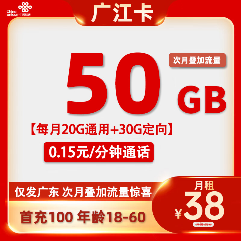 【广东专属】广江卡38元50G流量(次月叠加流量惊喜)