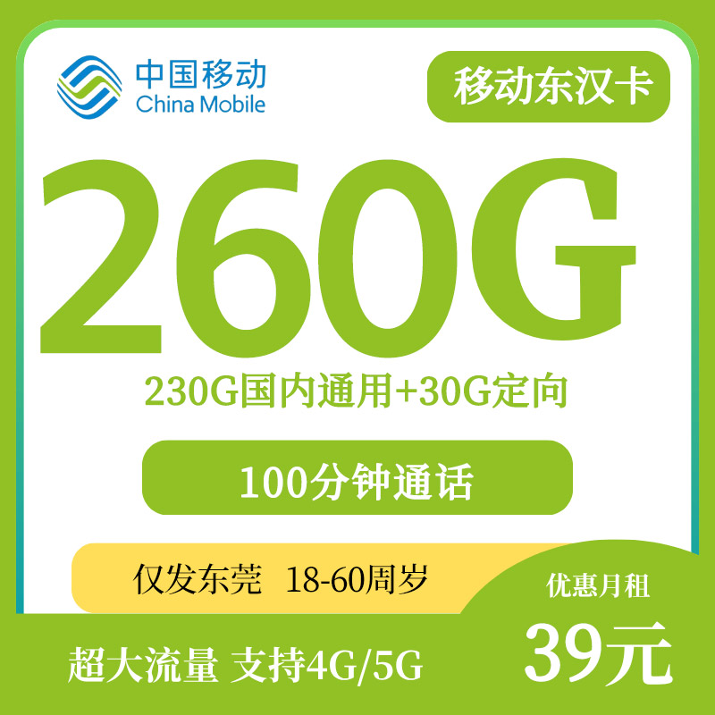 【东莞专属】移动东汉卡39元260G通用流量+100分钟通话